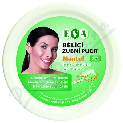Bělící zubní pudr je náhradou zubní pasty, určen pro domácí bezpečné bělení zubů. Pudr s obsahem mentolu odstraňuje nebezpečné bakterie, osvěžuje dech, má mimořádně příjemnou chuť, desinfikuje ústní dutinu, obsahuje výtažky ze silice.