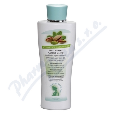 KARLOVARSKÉ PLEŤOVÉ MLÉKO s pistáciovým olejem, vitamínem E, panthenolem, koenzymem Q10 a karlovarskou vřídelní solí. Obsažené látky pomájí obnovit přirozenou lipidickou bariéru, pleť je vypnutá a pružná. Vhodné i k masážím obličeje a těla.