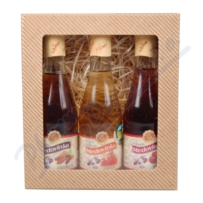 Exkluzivní dárková kazeta obsahuje 3 ks lahviček kvalitní medovinky různých druhů z českého medu o objemu 0,2 litru/kus. Výrobek velmi typické a lahodné chuti pro povzbuzení těla i mysli a duševní pohodu.