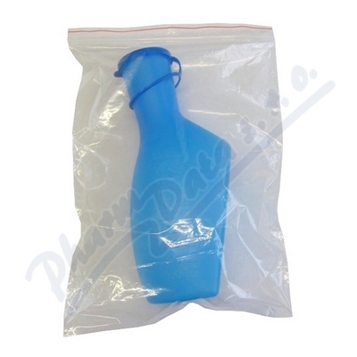 Modrá láhev na moč s uzávěrem v PE sáčku - plastová láhev o objemu 1000ml, s dělenou stupnicí po 50ml, opatřená modrým uzávěrem. Je určena zejména špatně pohyblivým nebo nepohyblivým pacientům (mužům) k zachycení jednotlivých porcí moči.