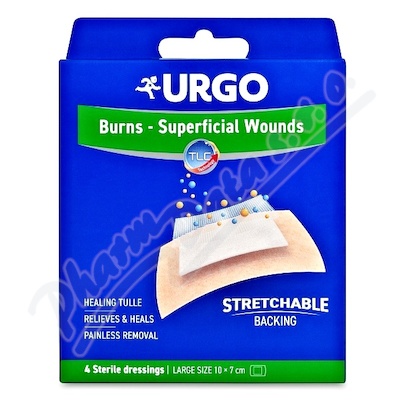 URGO Burns Na popáleniny a povrchové rány jsou sterilní náplasti připravené k okamžitému použití na ošetření popálenin 1.stupně, povrchových popálenin 2. stupně a povrchových ran.