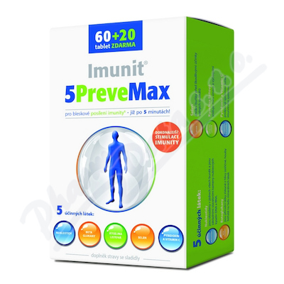 Imunit® 5PreveMax je doplněk stravy s jahodovou příchutí. Obsahuje nukleotidy chlorelly a beta-glukany z hlívy ústřičné. Vitaminy C a B6 pomáhají udržovat správnou funkci imunitního systému. Kyselina listová snižuje míru únavy a vyčerpání.
