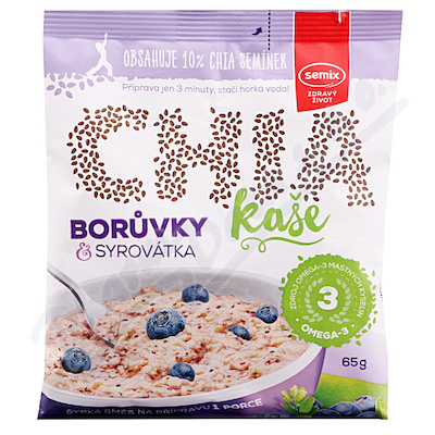 Chia kaše s borůvkami a syrovátkou. Sypká směs na přípravu 1 porce. Hotová za 3 minuty, nevaří se, stačí horká voda.