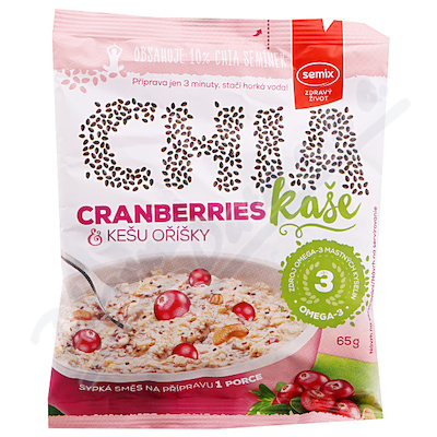 Chia kaše s brusinkami a kešu oříšky. Sypká směs na přípravu 1 porce. Hotová za 3 minuty, nevaří se, stačí horká voda.