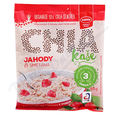Chia kaše s jahodami a smetanou. Sypká směs na přípravu 1 porce. Hotová za 3 minuty, nevaří se, stačí horká voda.