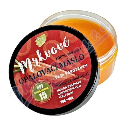100% přírodní mrkvové opalovací máslo s beta karotenem SPF15 pro dlouhodobé a zdravé opálení, které je voděodolné.