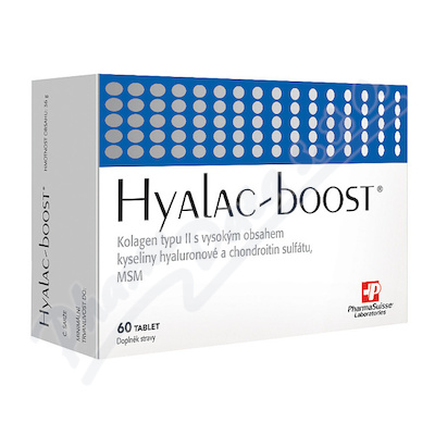 HYALAC-BOOST je doplněk stravy obsahující kolagen typu II (BioCell Collagen) s vysokým obsahem kyseliny hyaluronové, MSM a mléčné peptidy (Osteol).