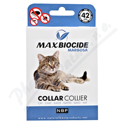 Max Biocide Cat Collar 42cm je netoxický obojek na bázi přírodních olejů, který efektivně odpuzuje klíšťata, blechy a jiný škodlivý hmyz. Obsahuje extrakt ze Zederachu indického, která nedráždí čich zvířete a je vhodný i pro citlivou pokožku. Voděodolný!