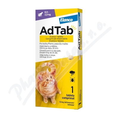 AdTab je chutná žvýkací tableta pro kočky. K léčbě napadení blechami a klíšťaty u koček. Tento veterinární léčivý přípravek má okamžitý smrtící účinek na blechy a klíšťata, který trvá 1 měsíc.