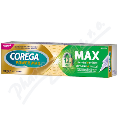 Corega Power Max upevnění a svěžest je fixační krém pro zubní náhrady pro pevnou fixaci po celý den se svěží příchutí máty.