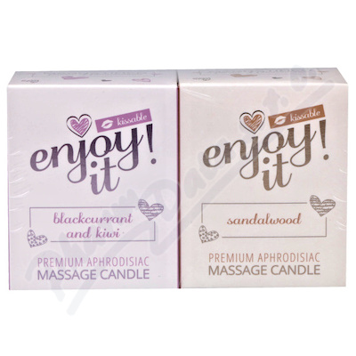Prémiové afrodiziakální masážní svíčky Enjoy it! z řady MAGNETIFICO - power of pheromones s vůní santalového dřeva a Blackcur-kiwi, 2x70 ml. Hydratuje, zjemňuje a regeneruje pokožku.