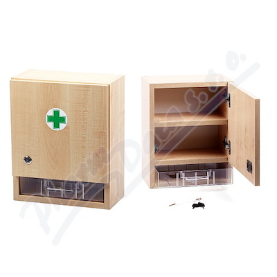 Prázdná nástěnná lékárnička o rozměru 40x31x17 cm. Skříňka lékárničky je vyrobena z dřevěného lamina a její součástí je praktická plastová zásuvka. Skříňka je uzamykatelná. Montážní materiál součástí.