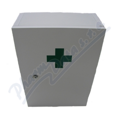 Lékárnička s náplní do 15-ti osob pro poskytnutí dočasné předlékařské první pomoci. Výrobky jsou uloženy v uzamykatelné skříňce.
