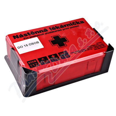 Lékárnička s náplní pro poskytnutí dočasné předlékařské první pomoci. Výronky jsou uloženy v uzamykatelné skříňce.